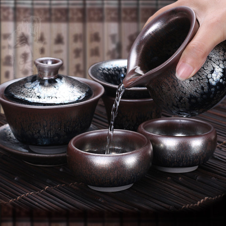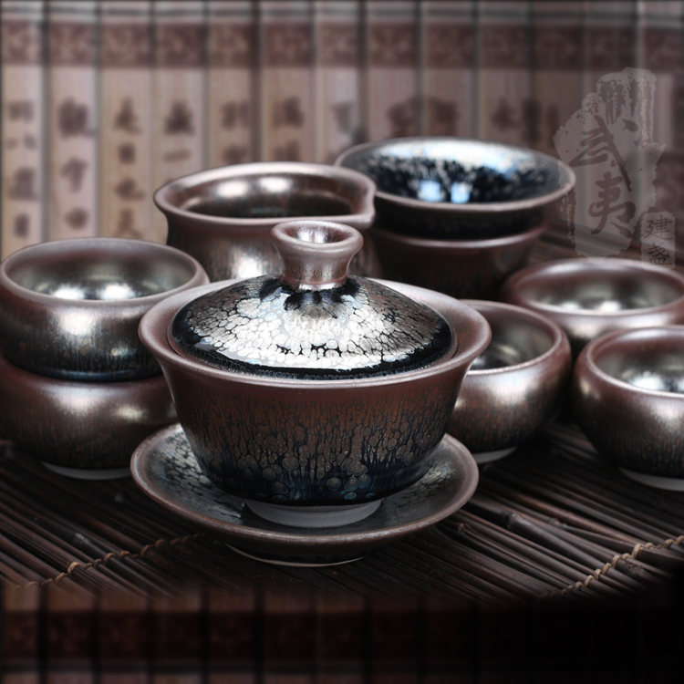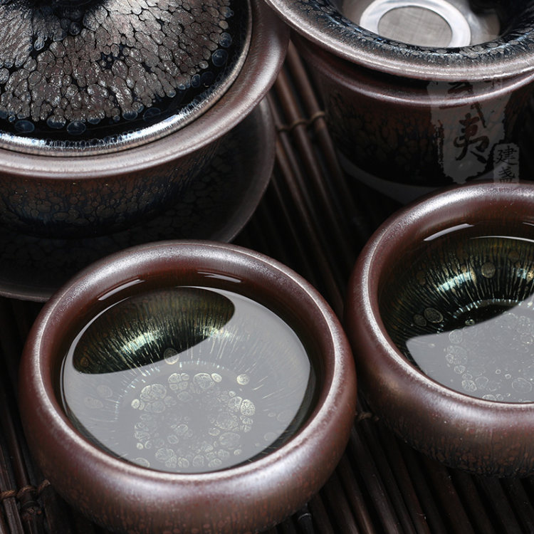 丁家相目前主制油滴建盏,他把制盏与画画相结合,追求完美,不仅从器型上讲究端庄古朴,器型不好,有瑕疵的根本不进下一步骤上釉烧制,更是从油滴上下功夫,力求油滴的形色完美结合,他烧制出的建盏,器型完美,油滴中折射出优雅的蓝色光泽,油滴形状从大到小,均匀分布于盏璧之上。用他制作的油滴盏沏茶时,在茶水的折射下,蓝油滴焕发出五彩光芒,和茶水交映,甚为神奇,很好的诠释了建盏的难以捉摸但有耀眼存在的特性。