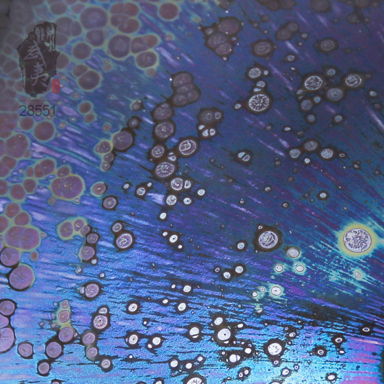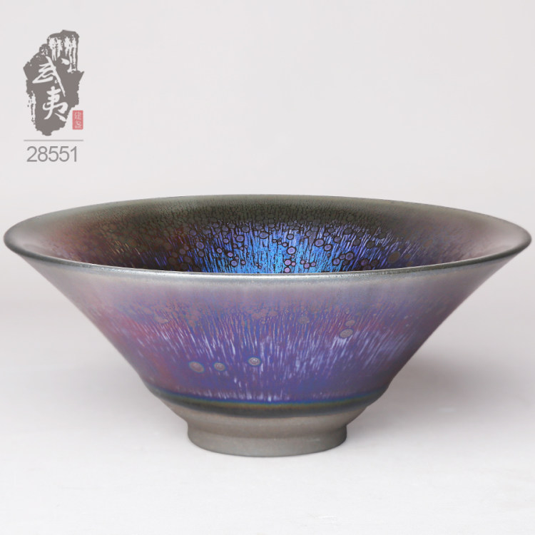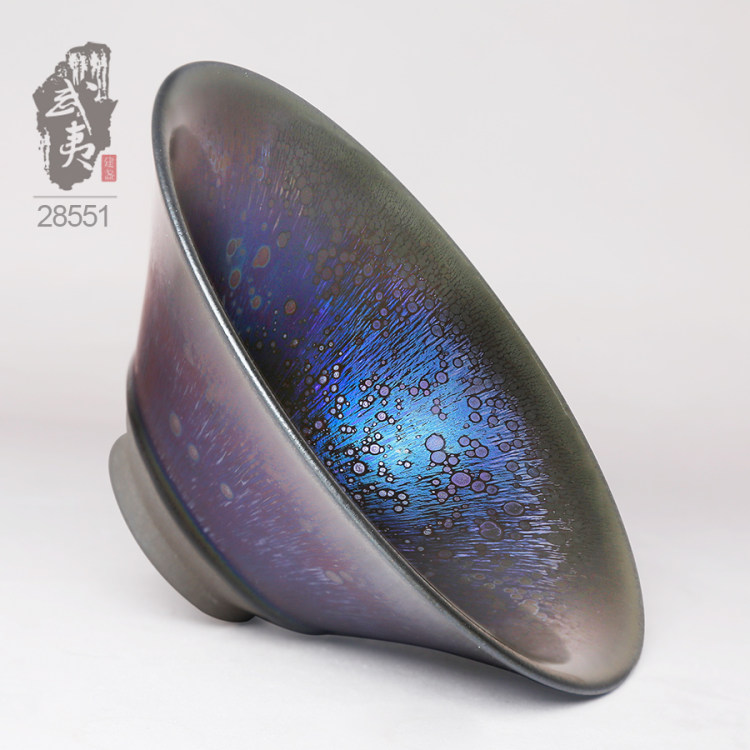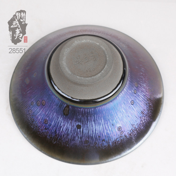 建盏界老一辈工艺师,其烧制的油滴盏,胎土纯正,器型圆润,斑纹饱满,色泽蓝中带银,十分优雅。