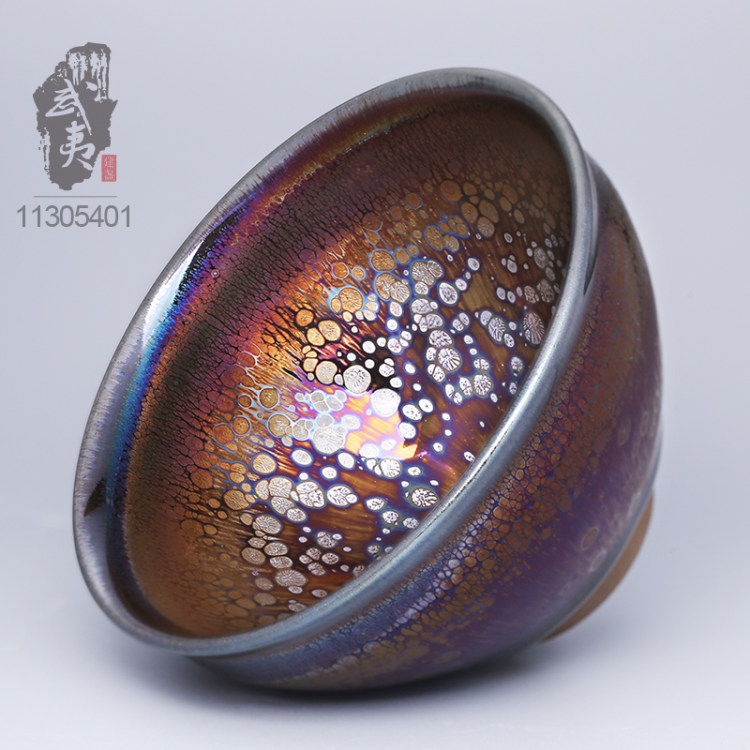 建盏界老一辈工艺师,其烧制的油滴盏,胎土纯正,器型圆润,斑纹饱满,色泽蓝中带银,十分优雅。