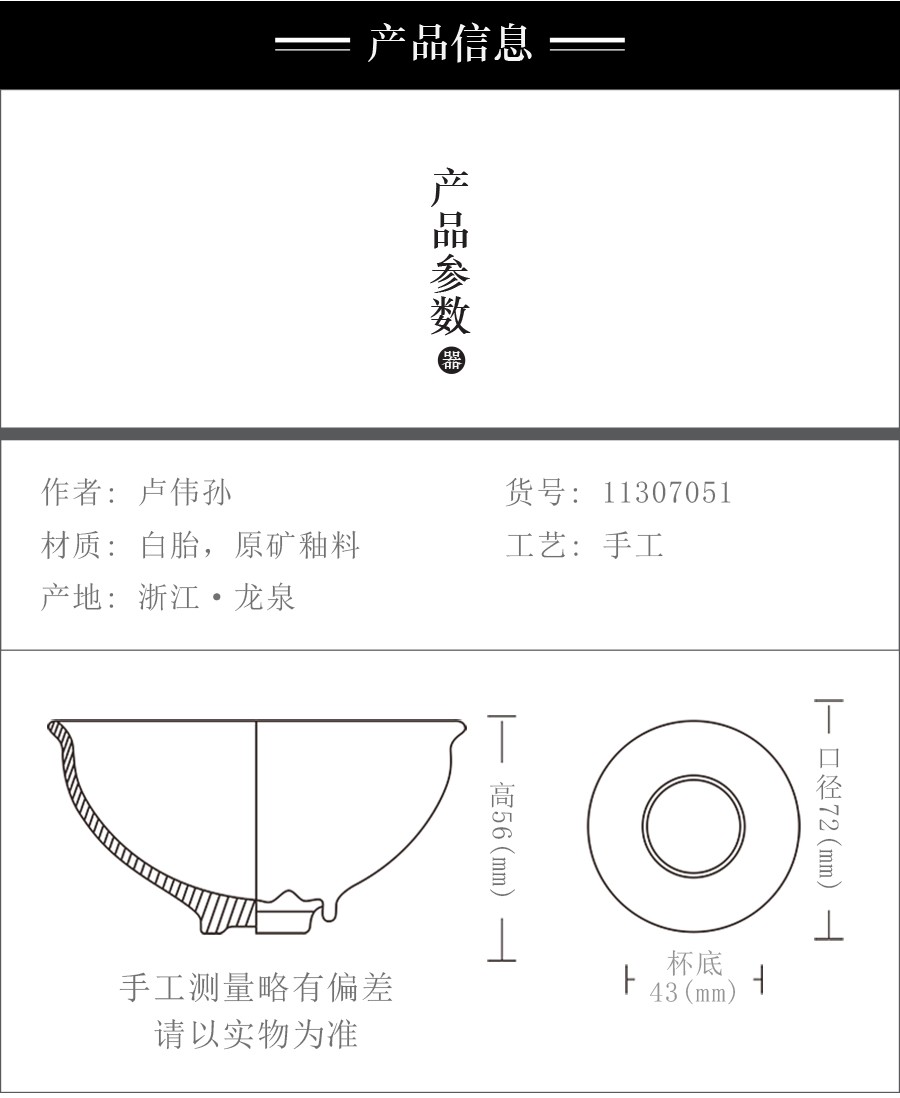 三、由于手工制品以及烧制过程中产生的窑变带来的特殊性,同款作品也有可能会在外观、色泽、尺寸和重量存在轻微差异,请以实际收到的作品为准;