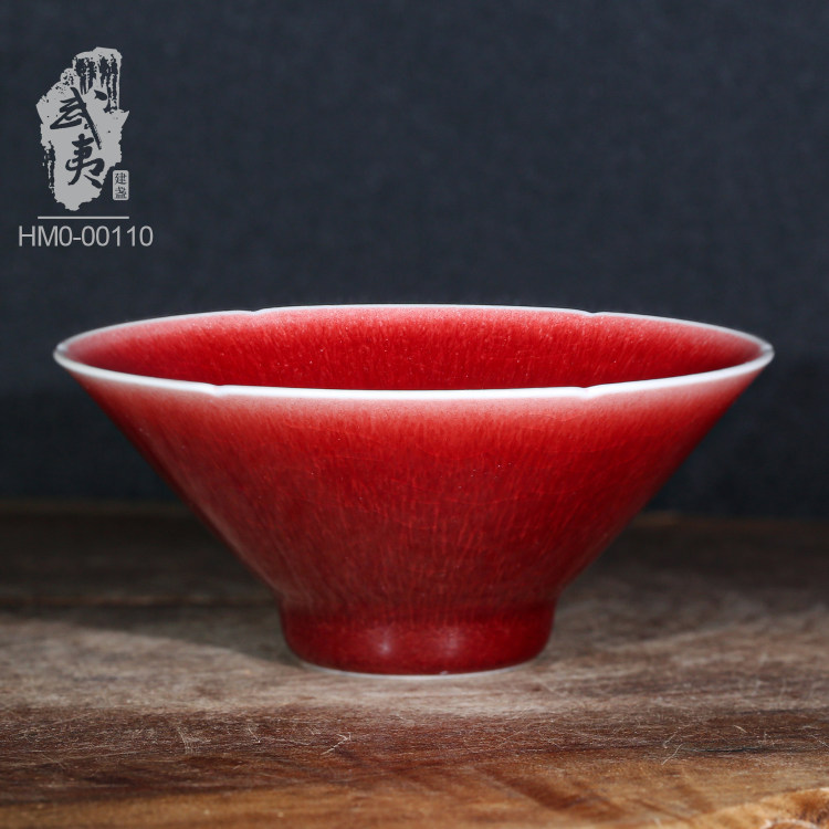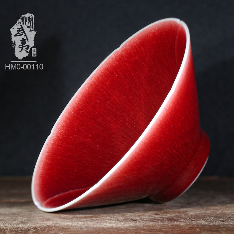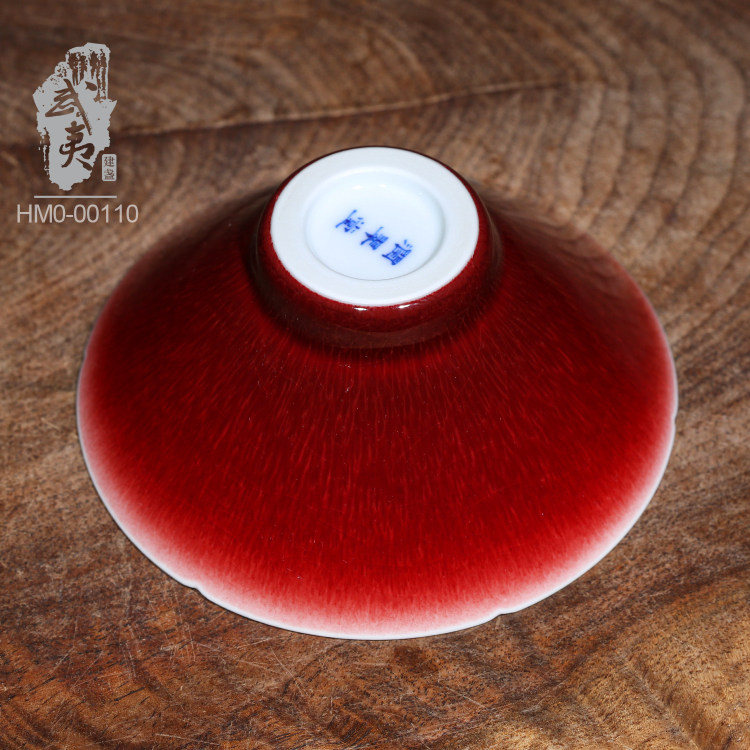 “脱口垂釉郎不流,牛毛开片非宣红”这是行业里对贡品级郎红特征的总结,简而言之,便是器物口沿呈一环露白,釉料垂流止于底而不过足,凝聚出鸡翅木纹;釉色层次分明,纹如牛毛,釉面带有冰裂纹,整器之红渐而万变,艳而不俗。贡品级郎红的烧制讲究天时地利人和,实属不易,故诸多逐利商人以化学品替代原矿釉料,致品相参差不齐。胡旻恪守本心,严于律己,不惜废万品,用实际行动守护传承下来的郎红技艺。