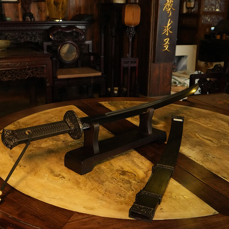材质:古法锻制毛铁剑身,铁装点银工艺外装,上等大叶紫檀木木鞘