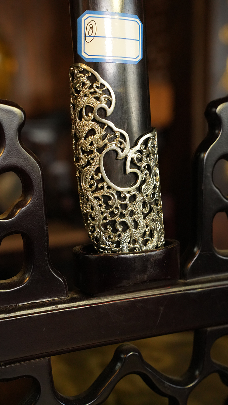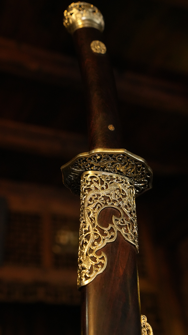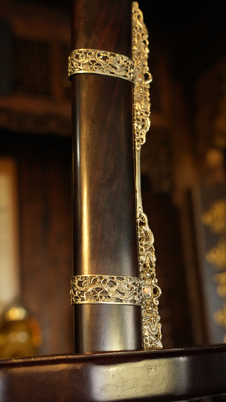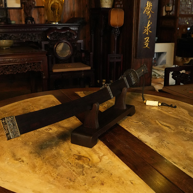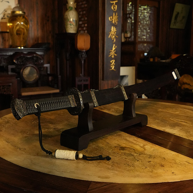 材质:古法锻制陨铁,烧制彩绘剑身,白铜手工精雕刻外装,上等黑檀木木鞘