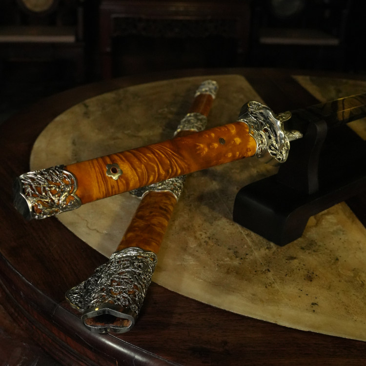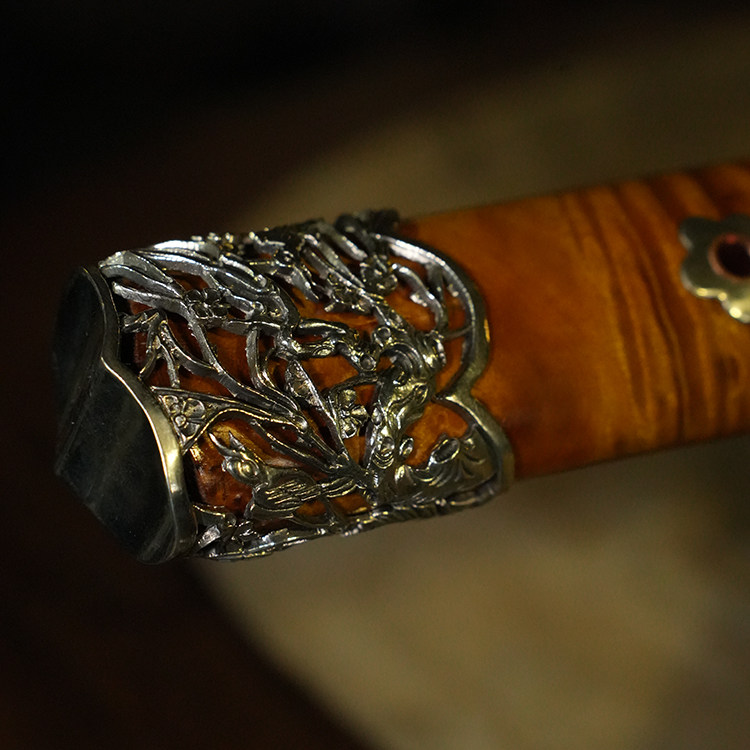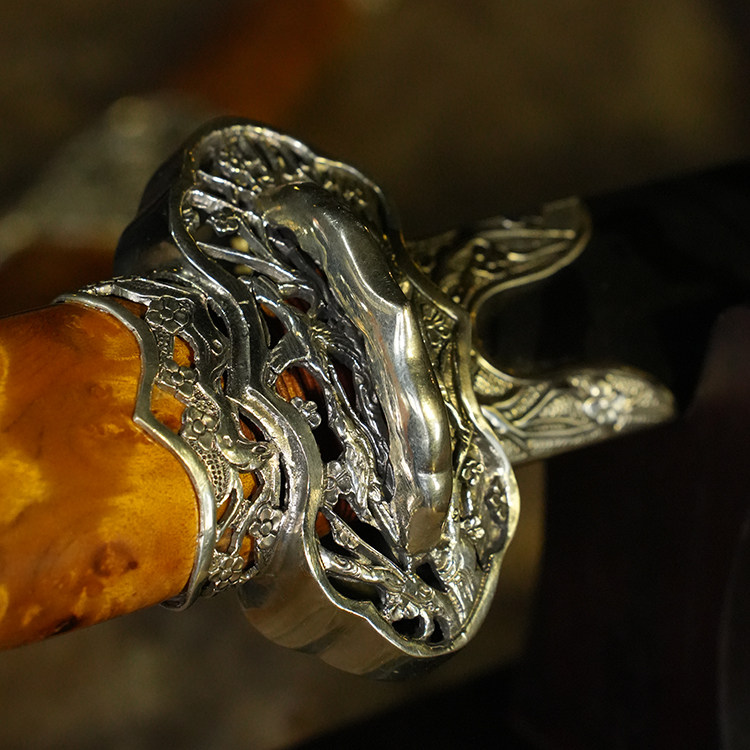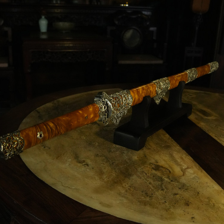 材质:古法锻制陨铁剑身,白铜手工精雕刻外装,上等金丝楠木鞘
