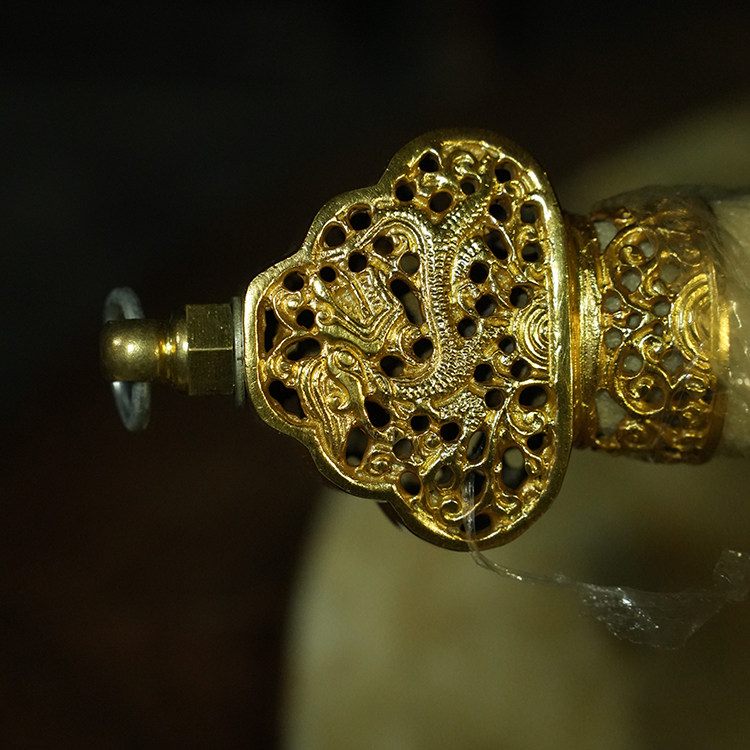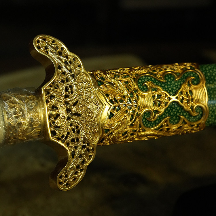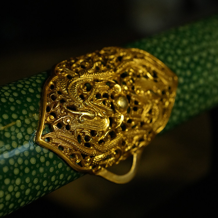 材质:古法锻制自炼百炼钢,羽毛纹剑身,铜鎏金,手工精雕外装,鱼皮包鞘剑鞘